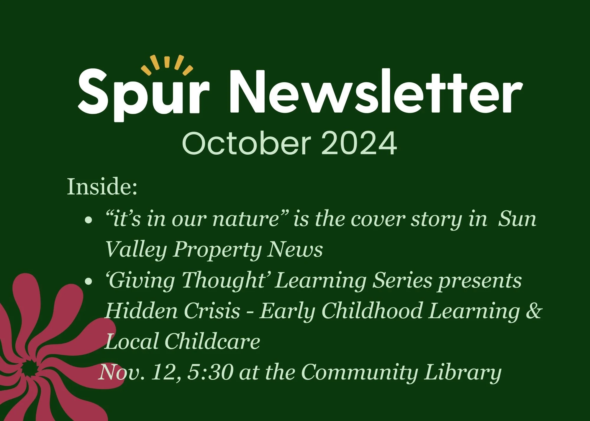 Spur's October News includes “it’s in our nature” being the cover story in SVPN, and information about the upcoming ‘Giving Thought’ Learning Series event: Hidden Crisis - Early Childhood Learning and Local Childcare.